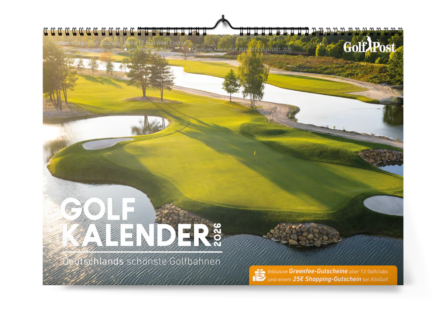 „Deutschlands schönste Golfbahnen“ lautet das Motto des Golfkalenders 2026. Mit dem Kalender an der Wand kannst Du jeden Monat aufs Neue von Birdies und Pars auf den schönsten Golfplätzen träumen. Ob im Wohnzimmer oder Büro, der Golfkalender ist ein wahrer Blickfang.