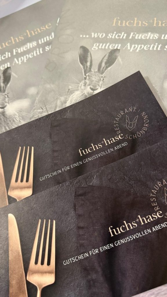 Erwerben Sie hier einen hochwertigen gedruckten Gutschein des Restaurants fuchs+hase im Hofgut Schönbronn. Der Wertgutschein wird Ihnen mit der Post zugesendet und ist in den Preis-Varianten 50 €, 100 €, 150 €, 200 € erhältlich.